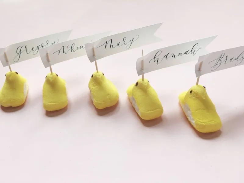 Okay, friends. This is a totally cute idea and actually super easy. Just cut strips of paper, write your guests' names and than use a toothpick to attach the name cards through the peeps!