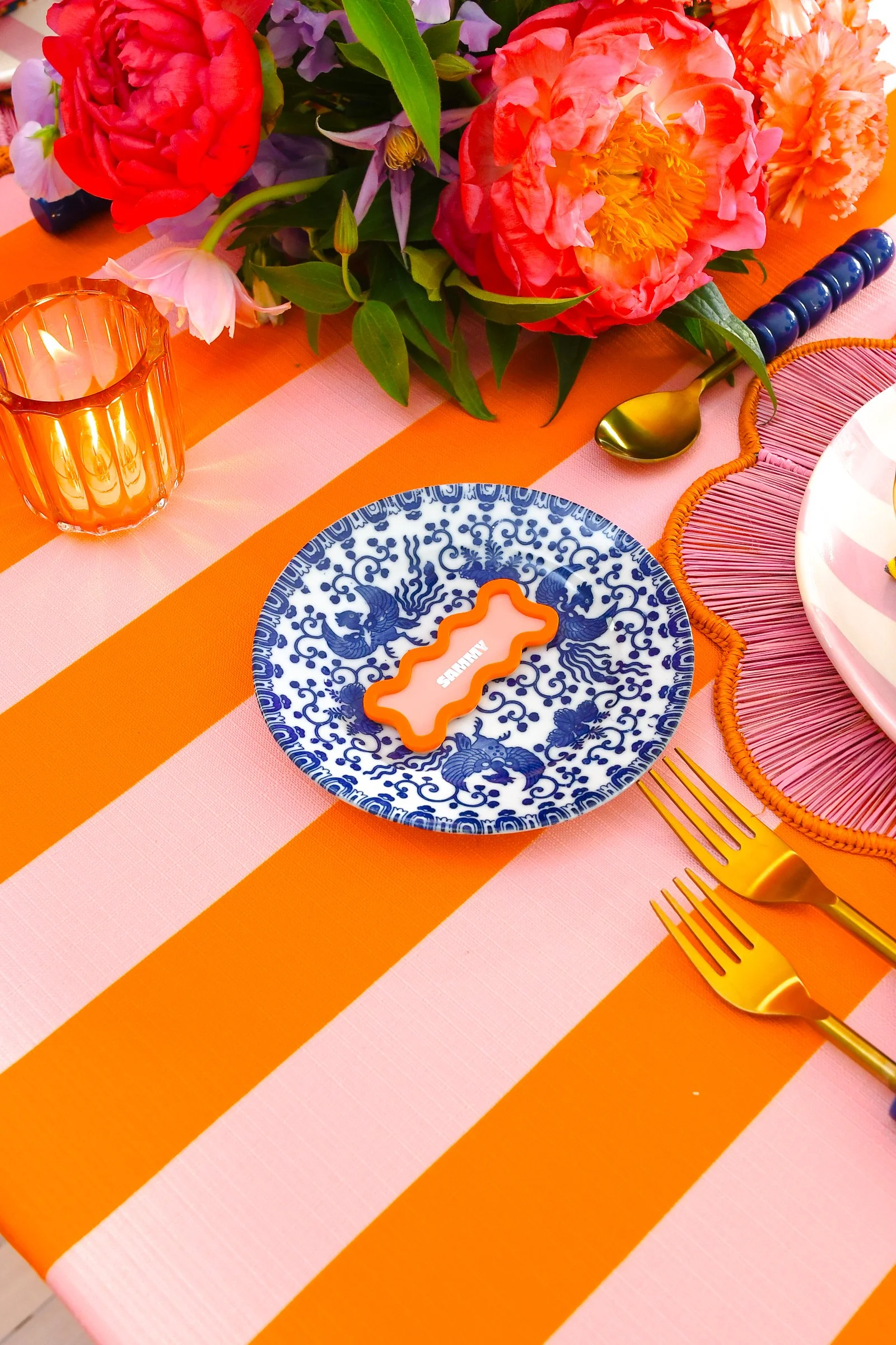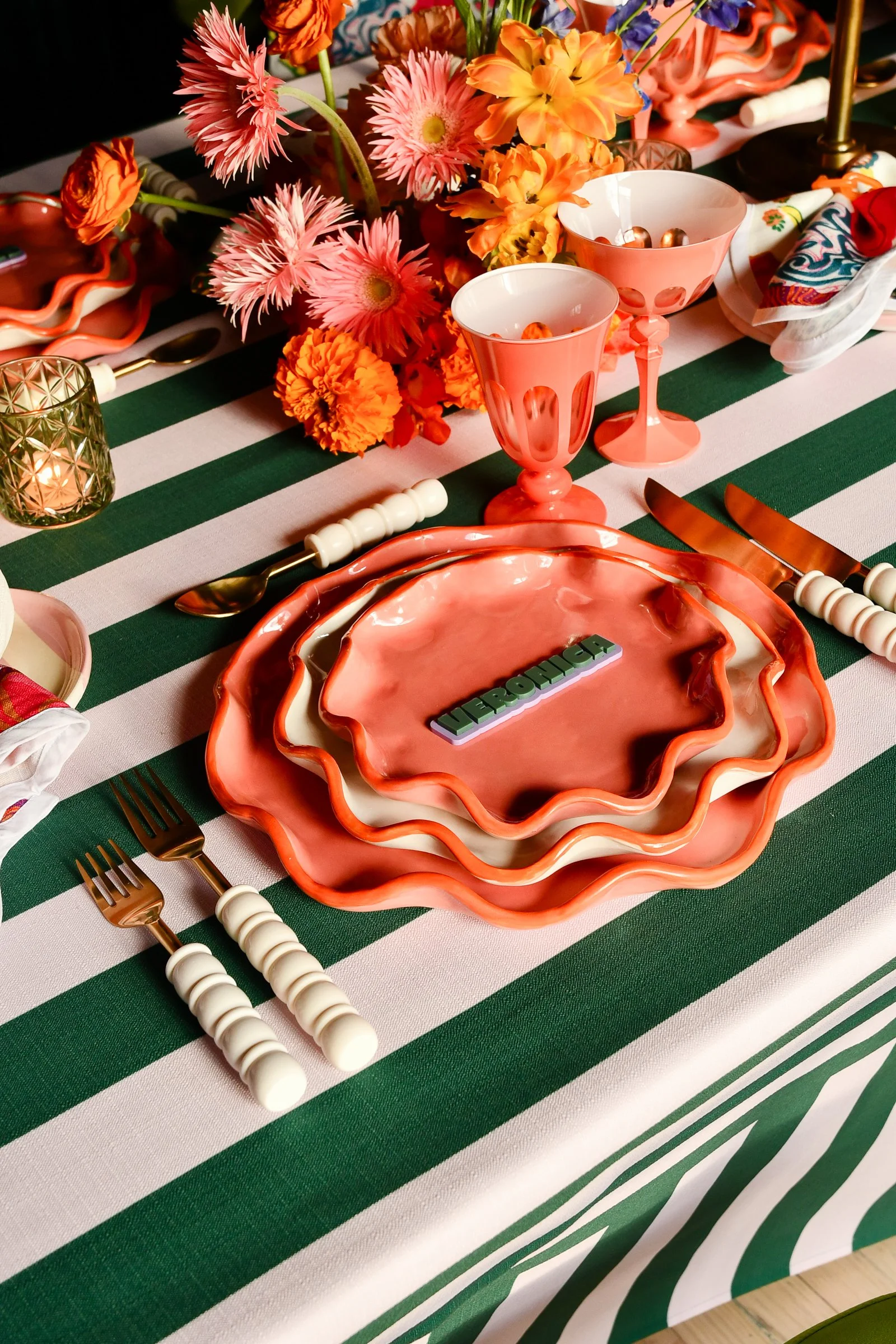 white wavy wedding table number with olive wavy frame on a styled wedding tablescape